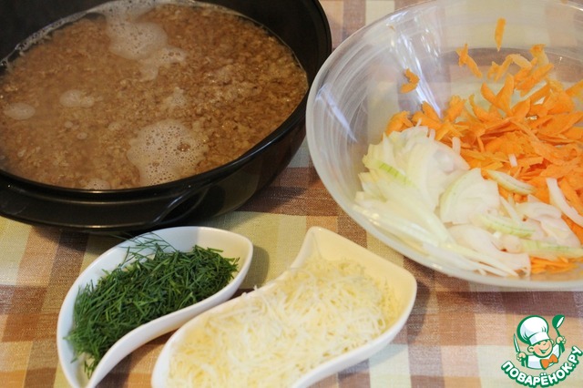 Гречневые хлопья зальем кипятком, в пропорции 1 к 2, согласно инструкции, накроем крышкой и оставим на 3 минуты. Лук нарежем тонкими четвертинками колец, морковь - на крупной терке, сыр и укроп мелко.