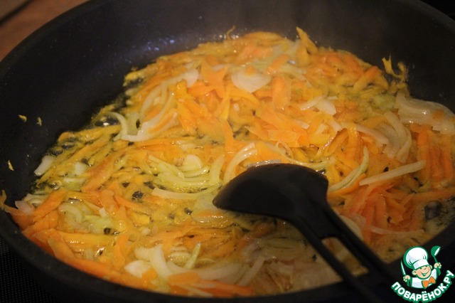 На смеси масел (сливочное и оливковое) обжарим до золотистого цвета морковь и лук.