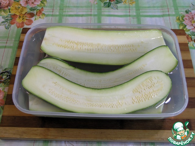 Кабачки разрезаем вдоль на две части. Укладываем в контейнер и заливаем водой. Добавляем уксус. оставляем мариноваться на 12-24 часа.