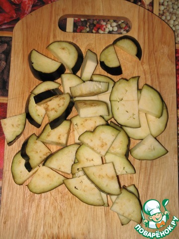 Баклажан нарезать кружками толщиной примерно по 0,5 см, затем порезать на половинки или четвертинки, посолить, оставить на 30-40 минут.