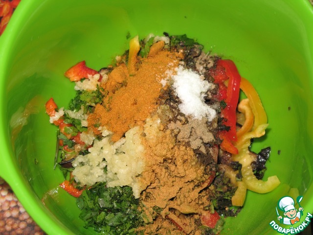 Баклажаны соединить с нарезанным перцем, зеленью и чесноком, добавить соль по вкусу, лимонный сок и специи. Можно добавить немного оливкового масла, оно слегка смягчит остроту блюда.