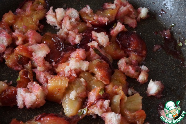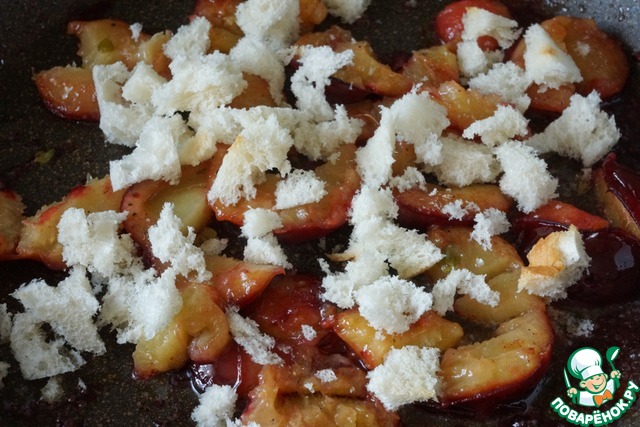 Несколько слив отложить для подачи, оставшиеся сливы слегка размять лопаточкой, добавить к ним хлебные крошки.