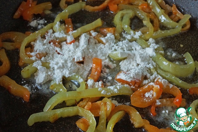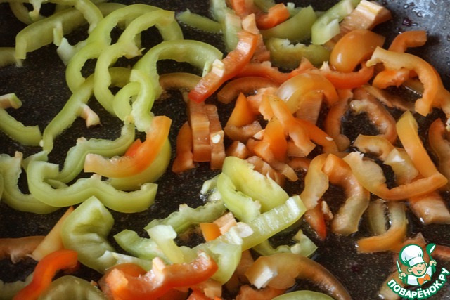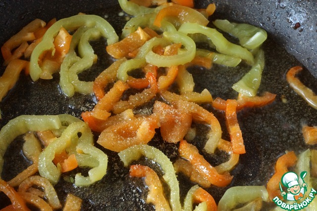 Затем на сковороде разогреть растительное масло и обжарить в нем перец, нарезанный полосками, жарить минут 10.