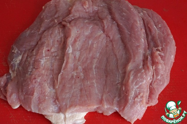 Теперь очередь заняться мясом. Кусок свинины (еще хорошо такой рулет делать из филе индейки) разрезать книжкой или по спирали, нам нужно из него сделать пласт.