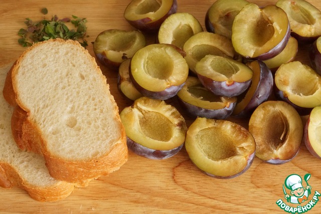 Начнем с приготовления начинки. Сливы помыть, освободить от косточек и разрезать пополам. С тимьяна оборвать листочки.