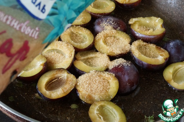 Добавить половинки слив и посыпать их 2-я. стол. ложками тростникового сахара. Потомить сливы минут 5-10, пока они не карамелизуются и на станут мягкими.