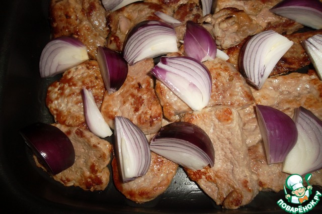 | В оригинале это свинина, но я свинину стараюсь не употреблять, а вот муж ее обожает. Готовила это блюдо частично из свинины, частично из телячьей вырезки. Время приготовления мяса одно и то же. Красивое оригинальное блюдо. Можно подавать на праздничный стол. Если готовить с телячьей вырезкой, то низкокалорийное. Овощи получаются "аль денте" то есть упругие. |