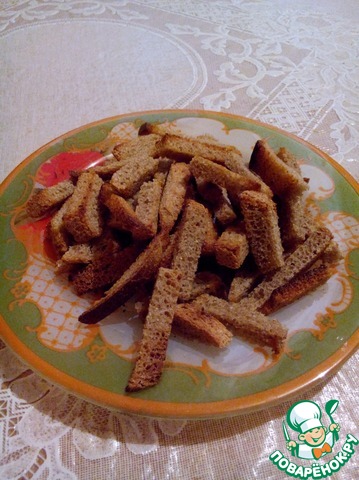 Подсушенный хлеб, порезать продолговатыми кусочками, обжарить на сухой сковороде (по желанию можно посолить, и добавить гранулированный сушеный чеснок)