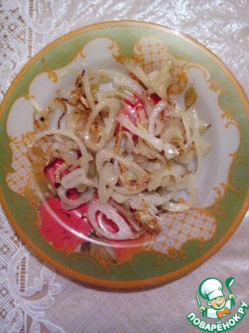 Лук нарезать полукольцами, обжарить на растительном масле.