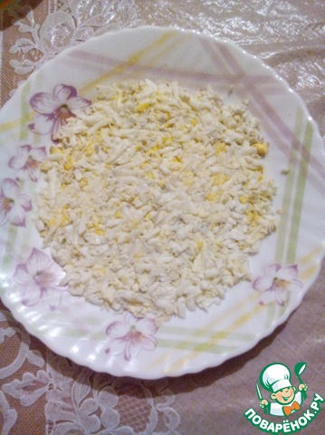 Отварить яйца, два яйца натереть на терке, это будет первый слой.