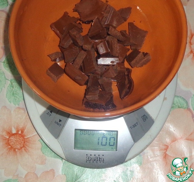 Понадобится 100 г шоколада. Я взяла молочный шоколад, поломать на небольшие кусочки.