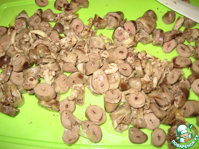 Куриные сердечки отвариваем в подсоленной воде примерно 25 минут, остужаем и нарезаем кружочками