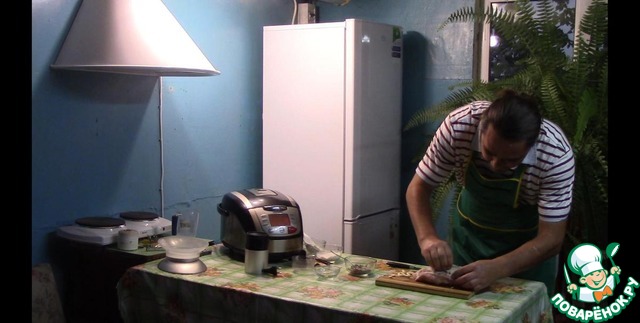 Достаем мясо из холодильника и обжариваем его в мультиварке со всех сторон в режиме "Мультиповар" (160 градусов, 10 минут), предварительно налив в чашу прибора растительное масло.