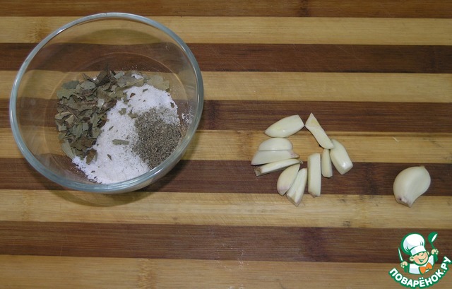 Натираем мясо оставшейся смесью и укладываем в пищевой контейнер. Ставим контейнер в холодильник на 1-12 часов.
