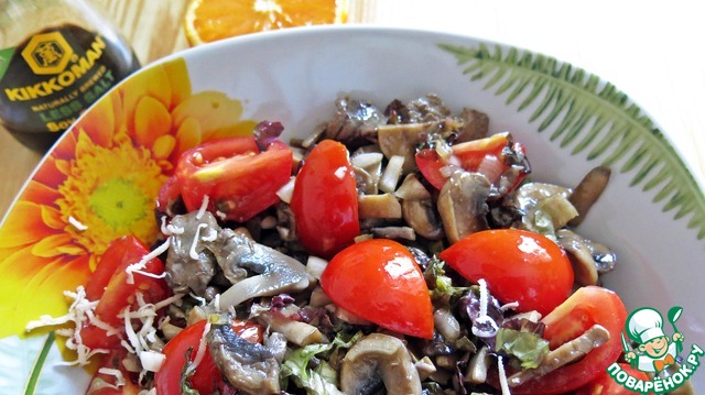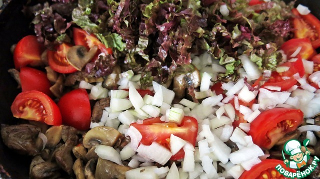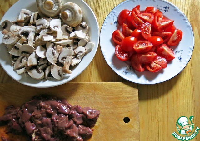 Сделаем заготовки для первой стадии готовки салата. Печенку промываем, нарезаем небольшими кусочками. Шампиньоны нарезаем произвольно. Черри разрезаем пополам, если маленькие. Если средние - на 4 дольки.