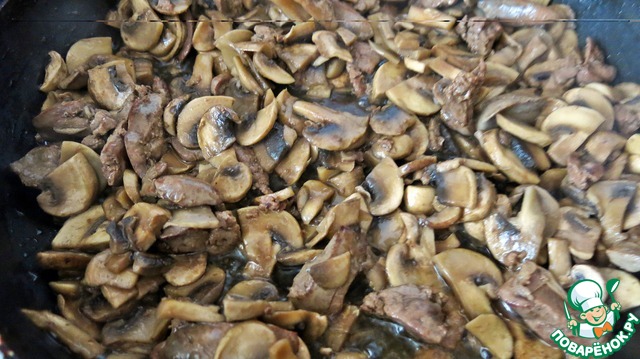 Добавляем шампиньоны, солим по вкусу и жарим до полного выпаривания жидкости.