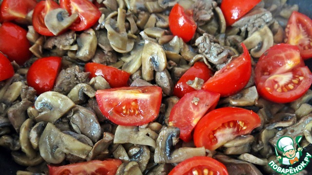 В конце выкладываем помидоры черри, аккуратно перемешиваем и снимаем с огня.
