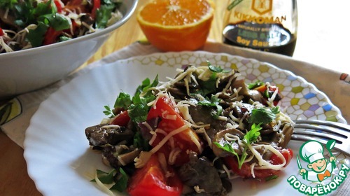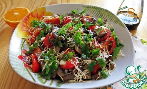 Даем салату немного настояться, подаем с натертым сыром и свежей зеленью! Ммм.. вкусно!