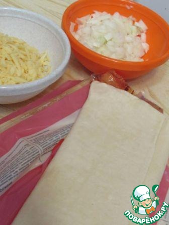 Лук мелко нарезать, сыр натереть на средней терке. Тесто должно быть комнатной температуры.