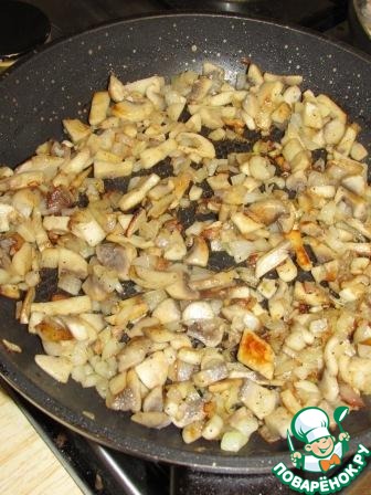 Грибы обжарить в сковороде на растительном масле в течении 5-7 мин. Лук добавить к грибам, посолить, поперчить и готовит на умеренном огне 10-15 мин.