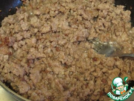 В отдельную сковороду вливаем 1,5 столовых ложки растительного масла, прогреваем и обжариваем фарш до золотистой корочки. Фарш разминаем вилкой, что бы он весь прожарился.