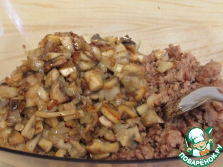 В отдельной посуде смешиваем грибной и мясной фарш. Духовку разореваем до 200 С.