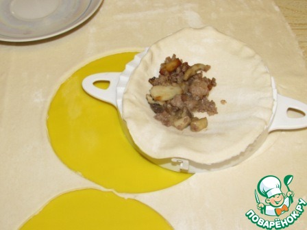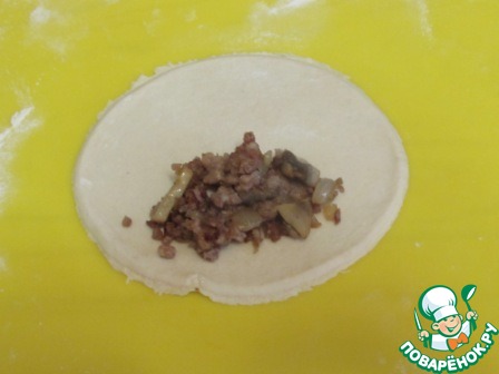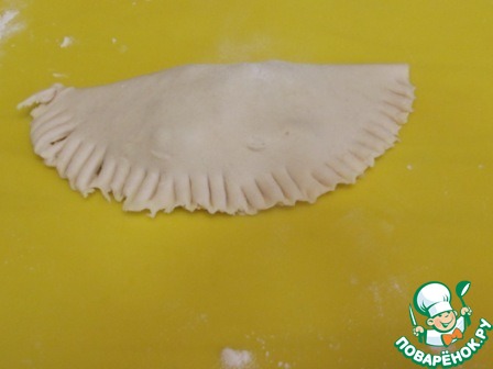 А можно вырезать чайным блюдцем кружок из теста, положить начинку и защипнуть края с помощью вилки.