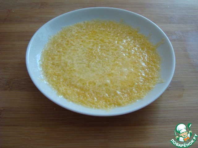 Положить натёртый сыр в блюдце и пальцами аккуратно распределить его по всему блюдцу. Поставить в СВЧ на 30 секунд при MAX мощности ( у меня 850W).