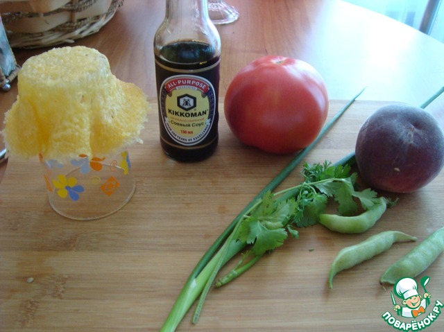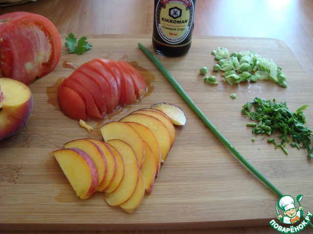 Сегодня я в неё положила салат с персиком, помидором, стручковым зелёным горошком, зелёным луком, заправленный йогуртом с соевым соусом, бальзамиком с кинзой.