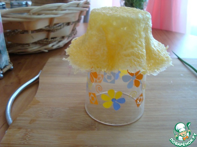 Перевернуть стакан и надеть круг сыра на дно стакана, красиво сформировать свисающие края. Тарталетка готова, когда сыр полностью остынет на стакане. Теперь можно в неё накладывать любимый вами салат.