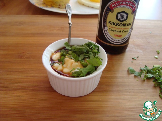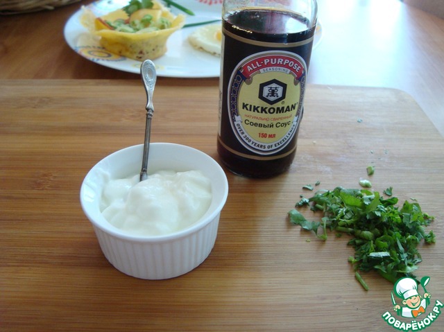 Добавляем в йогурт соевый соус, бальзамик, рубленную кинзу и всё перемешиваем. Пробуем и доводим до желаемого вкуса.