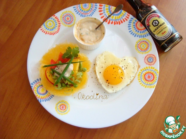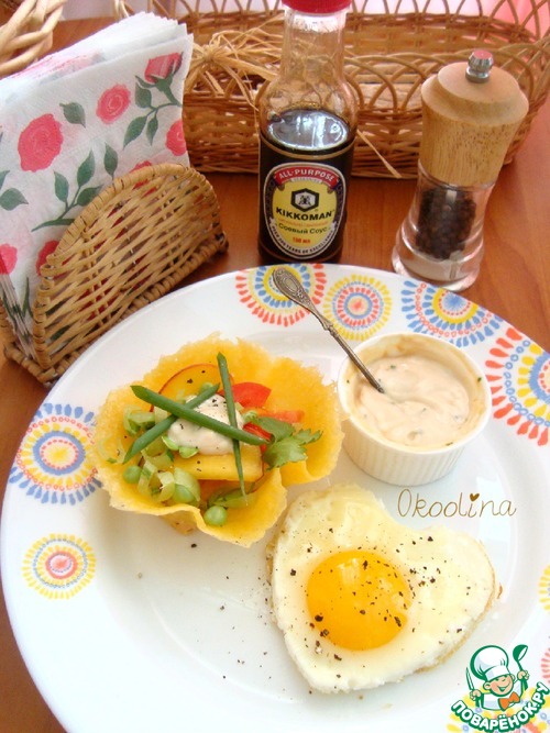 Для подачи берём большую тарелку. Выкладываем в неё глазунью, рядом ставим сырную тарталетку и соусник. В тарталетку кладём персик, помидор и зелёный горошек молодой, выкладываем соуса немного и украшаем стрелками зелёного лука и листиком кинзы. По вкусу и желанию перчим свежемолотым чёрным перцем.