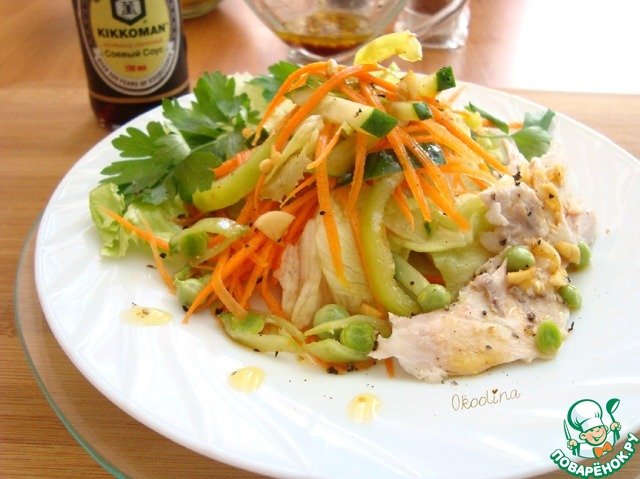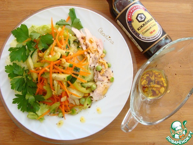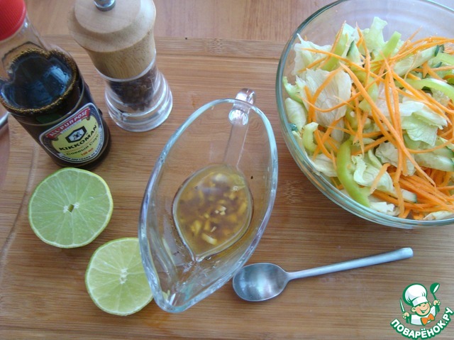 В оливковое масло наливаем соевый соус в соотношение 2 к 1, добавляем 1 ч л сока лайма (по вкусу), перчим, выкладываем чеснок. Всё перемешиваем и даём чуть постоять пока режем куриное мясо и выкладываем салат в тарелки.