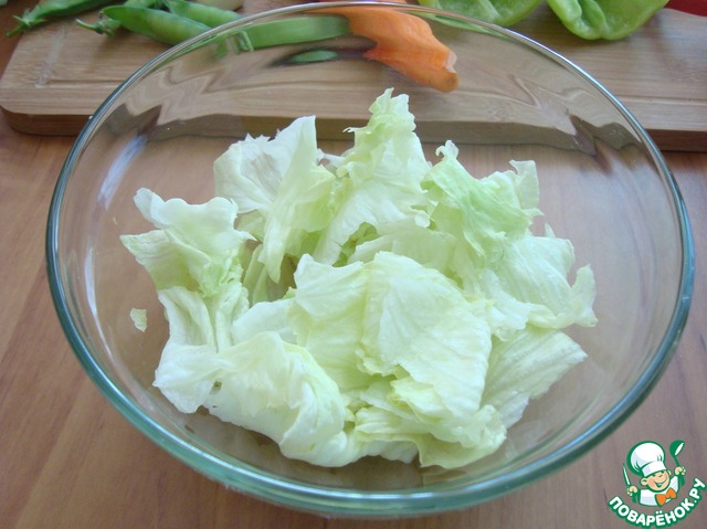 Кочан "Айсберга" разбираем на листья, берём 5 шт и рвём его руками в салатник. На две порции для подачи оставляем 2 листа.