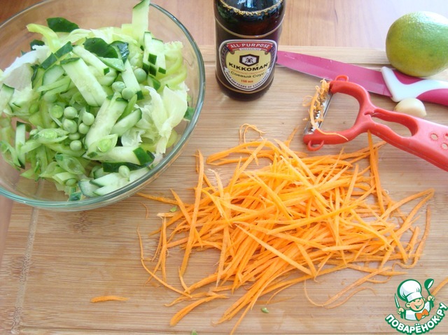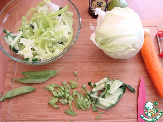 Огурец режем соломкой, перец болгарский тонкими полу-кольцами. Зелёный горошек (у меня "молочный") я порезала прямо в шкурке.