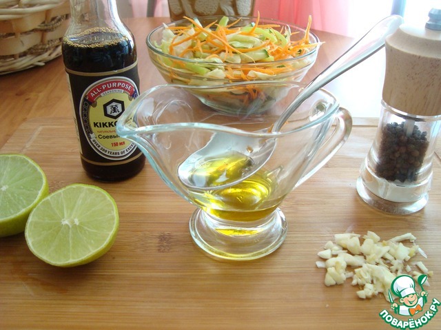 Делаем заправку для салата. Чеснок мелко рубим или давим, лайм разрезаем пополам, чтобы выжить из него сок. Берём оливковое масло и соевый соус, чёрный свеже-молотый перец.