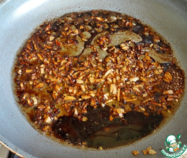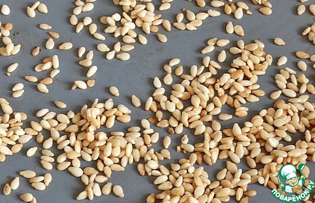 На сухой сковородке обжарить семена кунжута до лёгкого, золотистого цвета, чтобы он открыл свой неповторимый аромат.