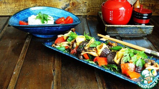 Выкладываем на плоскую тарелку листья салата рукколы или мицуны, кусочки баклажана прокладываем обжаренными овощами и грибами. Поливаем нашей замечательной заправкой. Сверху посыпаем обжаренными семенами кунжута.