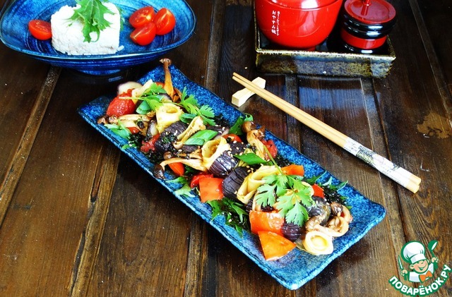 | Предлагаю вашему вниманию ещё одно блюдо азиатской кухни. Очень надеюсь, что оно вам понравится так же, как оно понравилось нам. Оно вкусное и нарядное, поэтому этот салат вполне может занять достойное место за праздничным столом. |