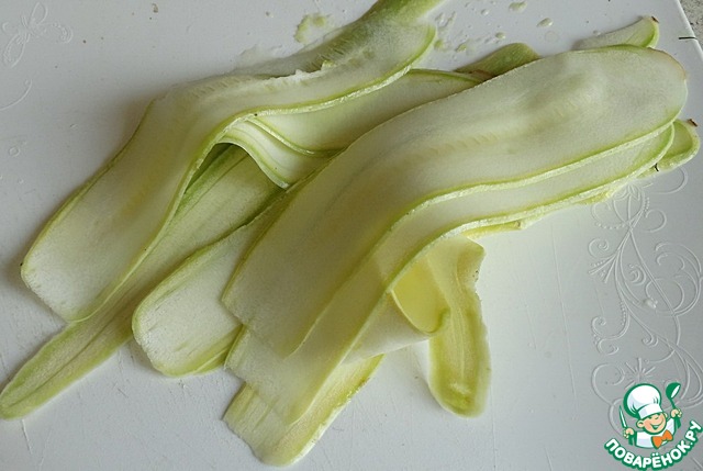 За это время подготавливаем другие овощи. Кабачок настругаем тонкими пластинками с помощью овощечистки.