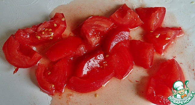 Помидоры освободим от семечек и нарежем только стенки такими же кусочками, как и перец.