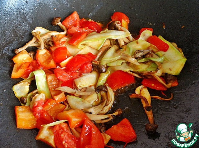 Грибы разбираем по одному-два. В сковороде - вок разогреваем растительное масло и быстро обжариваем все овощи до готовности. Выкладываем на отдельную тарелку и ставим остывать в прохладное место.