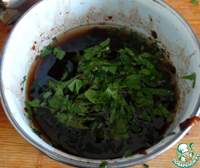 В отдельную чашку складываем поджаренные лук и чеснок, добавляем 2 ст. л. соуса TERIYAKI ТМ Kikkoman, бальзамик и кунжутное масло.