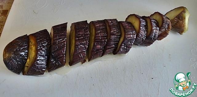 Отваренный баклажан остужаем в холодной воде, отжимаем немного лишнюю жидкость и режем на кусочки примерно 1 см.