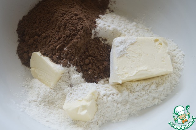 Смешать сухие ингредиенты: муку, какао, сахар и разрыхлитель. Добавить к ним сливочное масло и растереть в крошку.