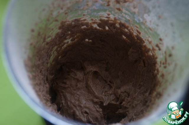 Пока кекс выпекается приготовим крем. Для этого Масло взобьем с сахарной пудрой и какао, затем добавим молоко, коньяк и снова взобьем в пышную массу.