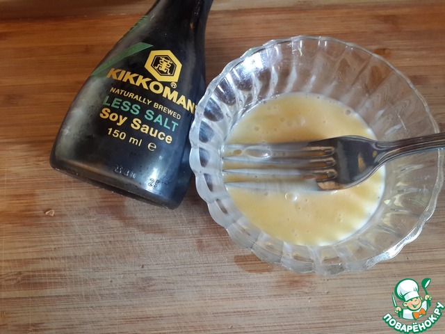 Яйца взбить венчиком с добавлением 2 ч. л. соевого соуса