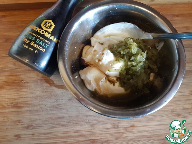 Для этого смешать майонез, соевый соус "Кикоман", натертый на мелкой терке маринованный огурчик. Если соус получается густой - добавьте пару ложек рассола от огурцов и чуть взбейте соус венчиком или вилкой