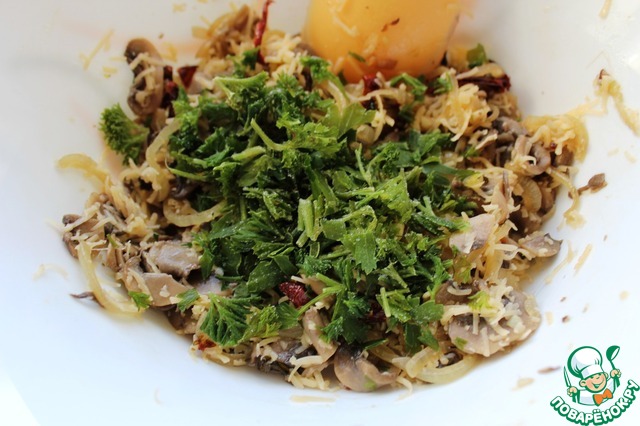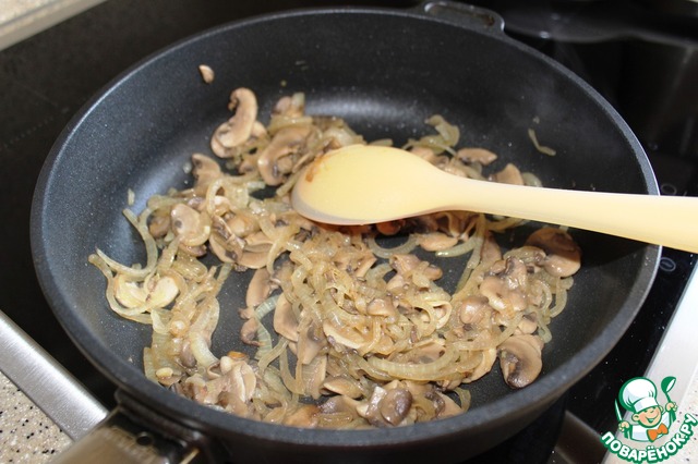Добавляем к луку грибы, и продолжаем обжаривать до выпаривания жидкости, даем остыть, солим и перчим.
