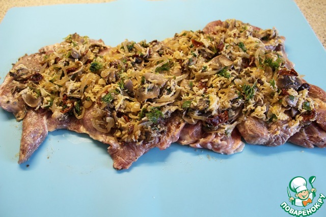 Из холодильника вынимаем индейку, разворачиваем, наносим начинку, разравниваем.